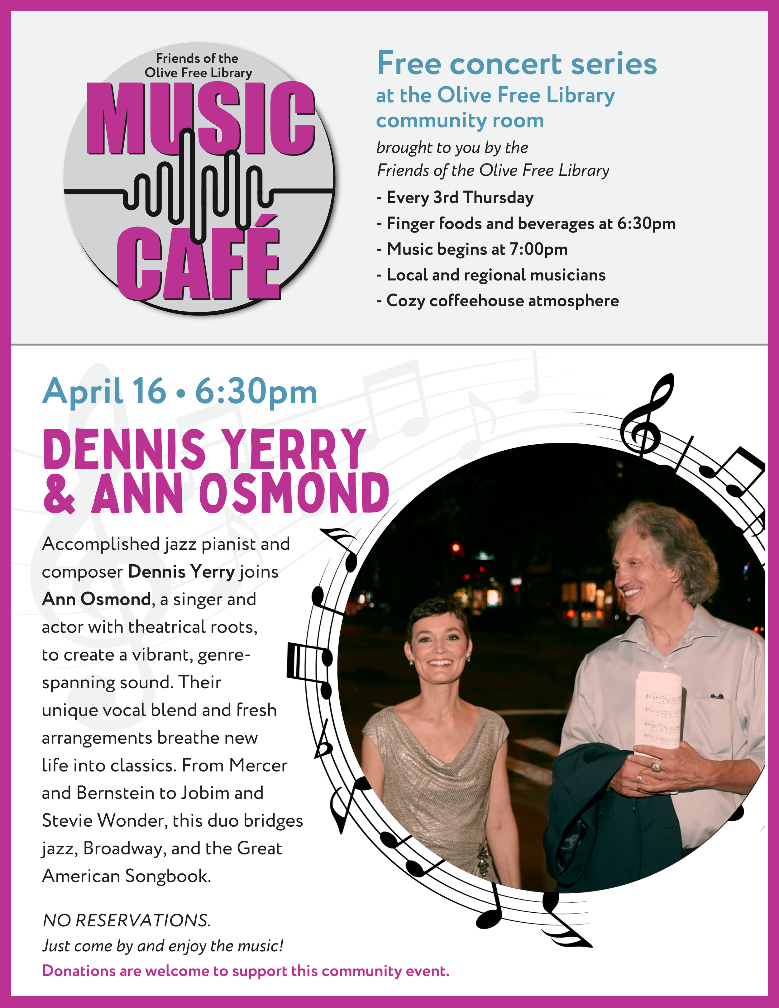We are excited to welcome Dennis Yerry & Ann Osmond back for an encore performance at Music Café on Thursday, April 16 at 6:30 PM.